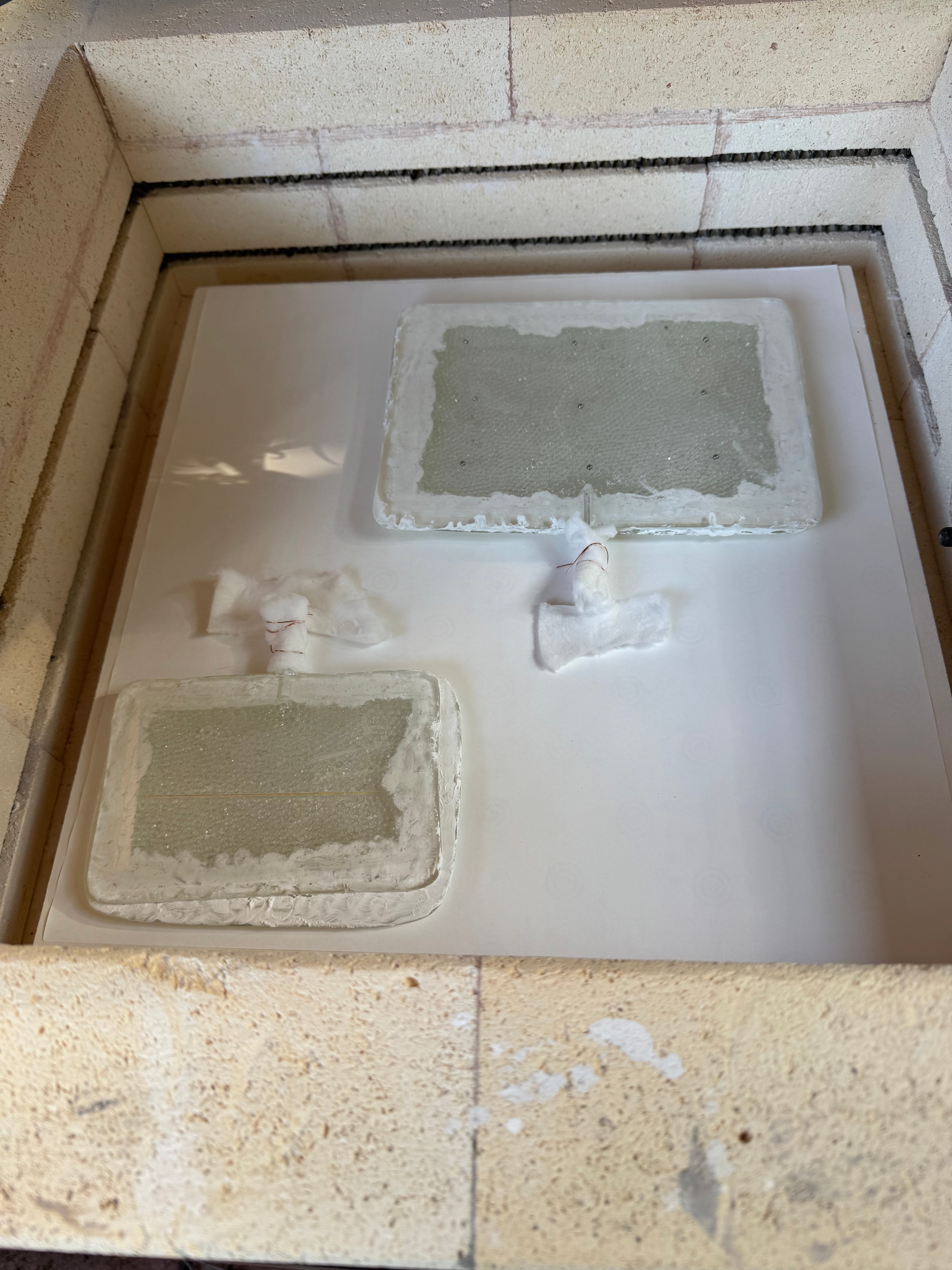 I was able to get a big (for me) clamshell kiln to make bigger pieces! I can go up to around 16” pieces instead of the previous 10” limit with my main kiln. Or, as my daughter would say, I can make “mama” and “baby” glass art now.